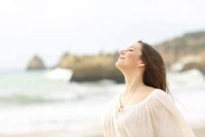 an image of a male practicing mindfulness techniques for recovery while inhaling through his nose with his eyes closed on a white background.