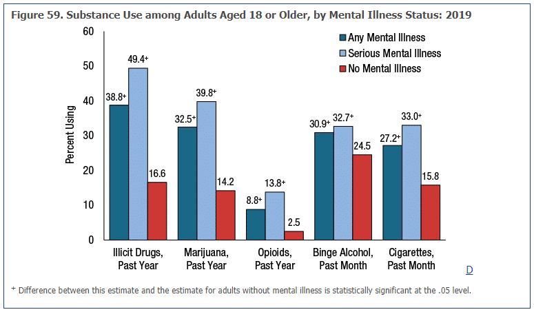 According to the most recent data from the Substance Abuse and Mental Health Services Administration (SAMHSA), in 2019 it was reported that 9.5 million Americans have both a substance abuse and a mental health disorder (approximately 3.8% of the total population). However, these numbers are likely much higher as more than half of all adults and children with a mental health condition don’t receive treatment or are properly diagnosed. Those 18 and older who have a mental illness have been found to up to 3 times more likely to use illicit drugs and marijuana, twice as likely to smoke cigarettes, about 50% more likely to binge drink, and an astounding 5.2 times more likely to abuse opioids.